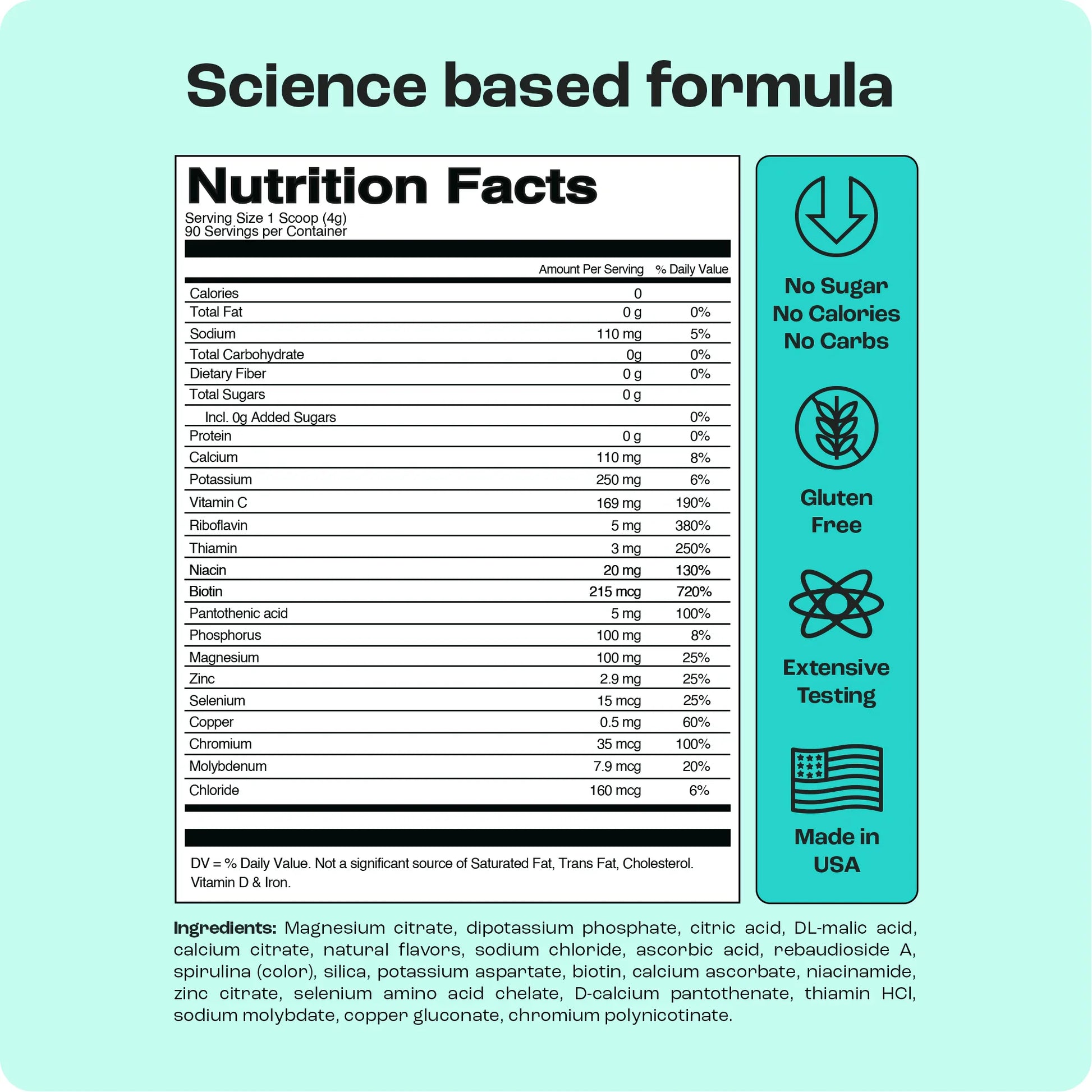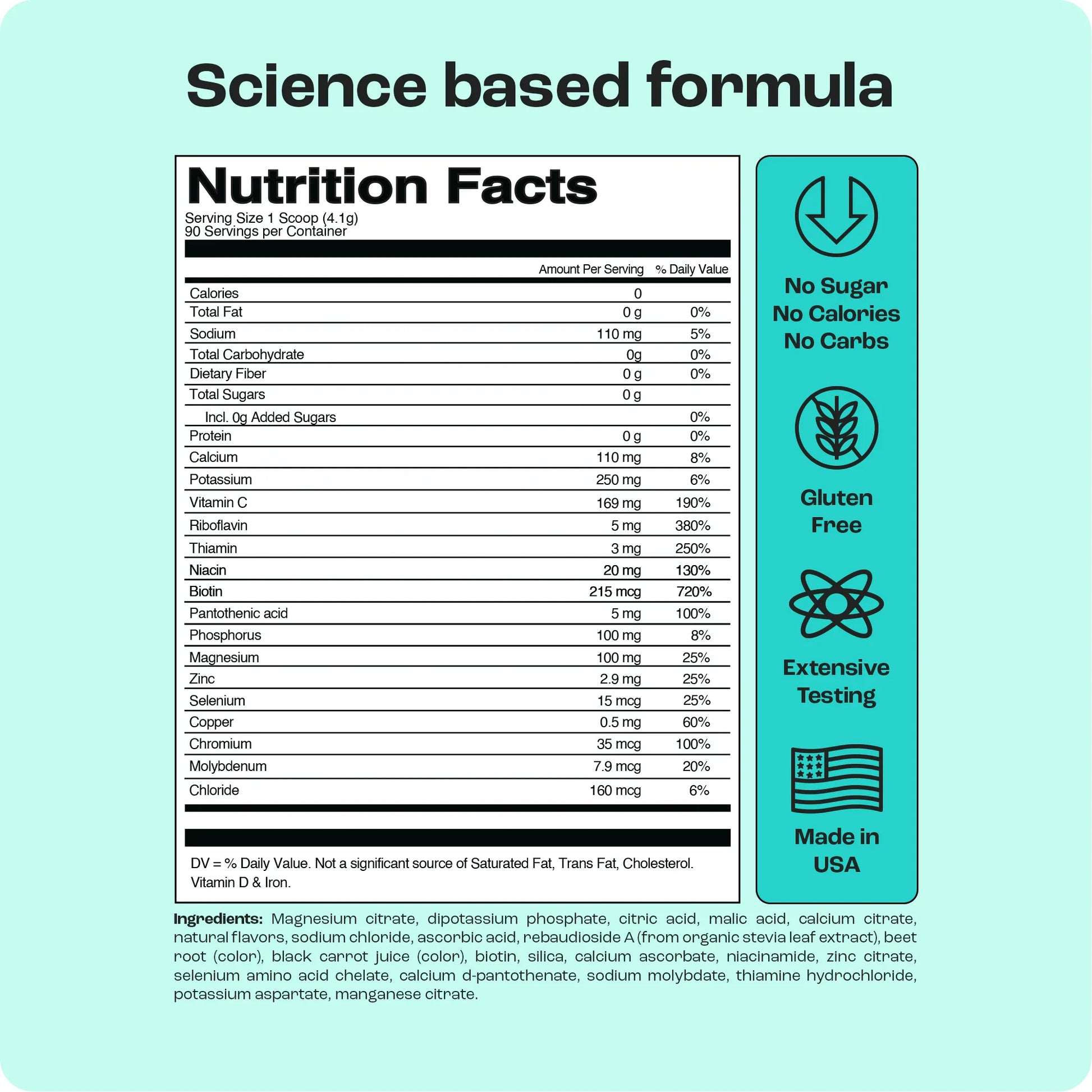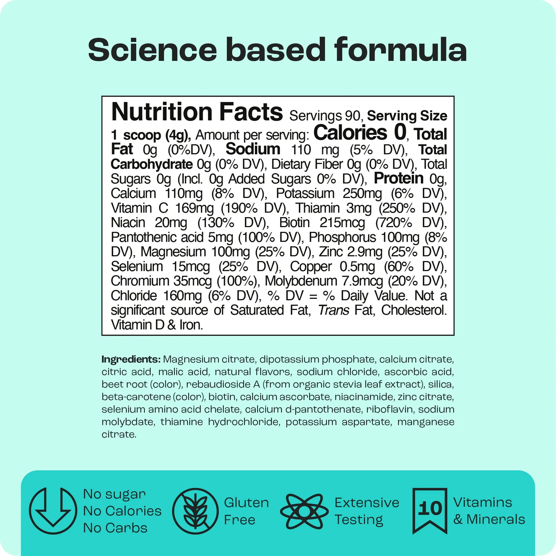 - Electrolytes You Can Trust - Hydrate your body, regulate nerve & muscle function and rebuild damaged muscle tissue with 6 key electrolytes: Magnesium, Potassium, Calcium & more. Enriched with 12 additional vitamins, this electrolyte mix drink is free from artificial colors and sweeteners.