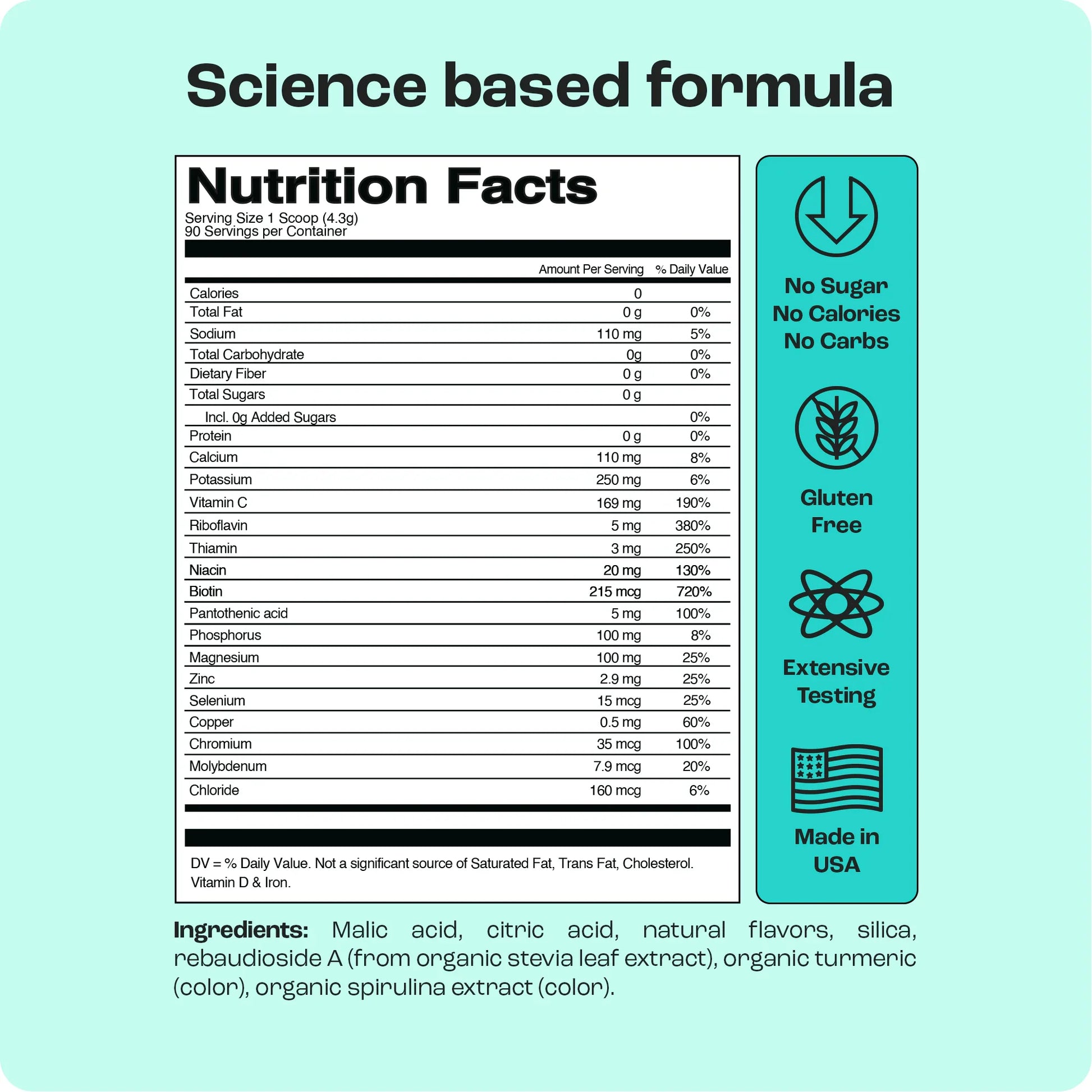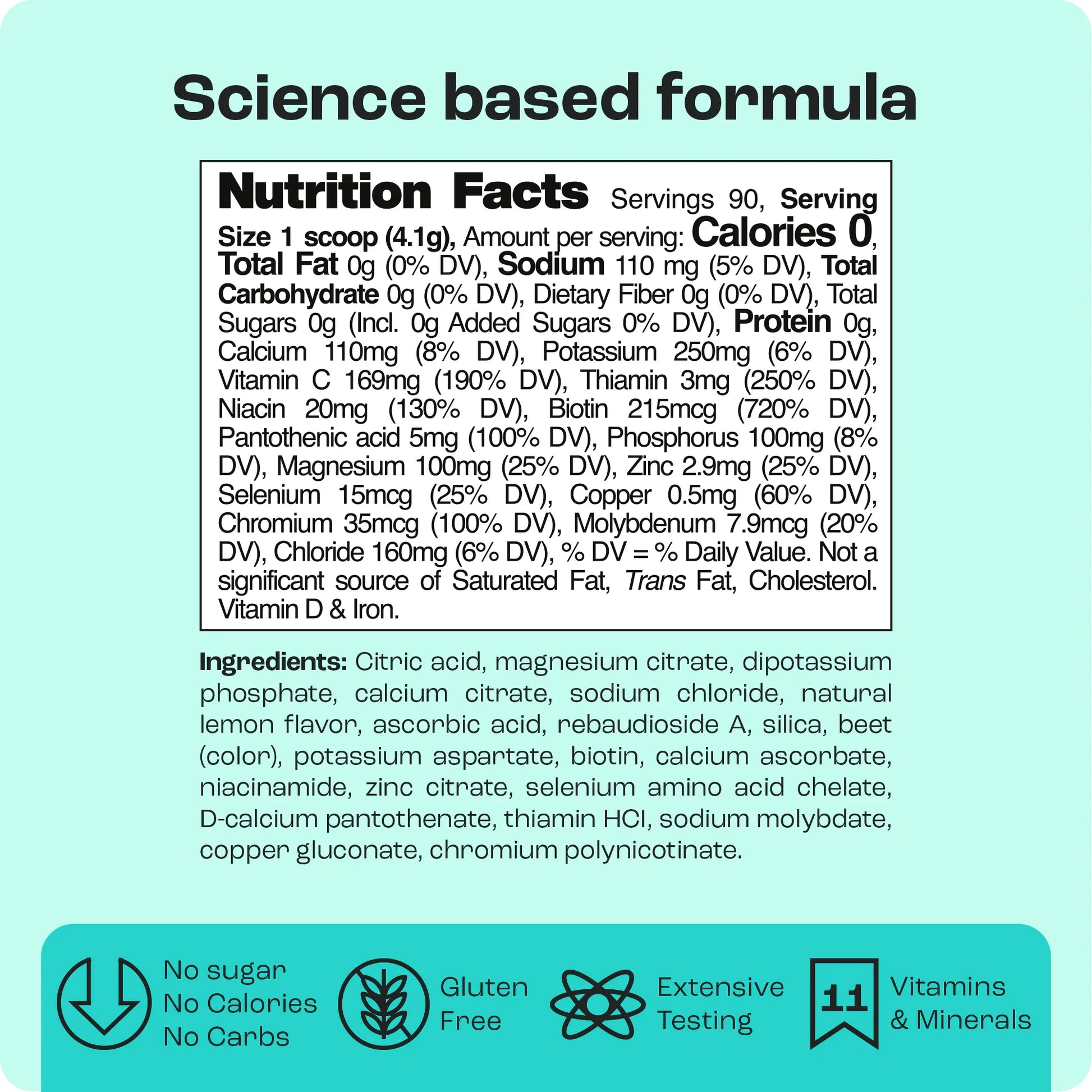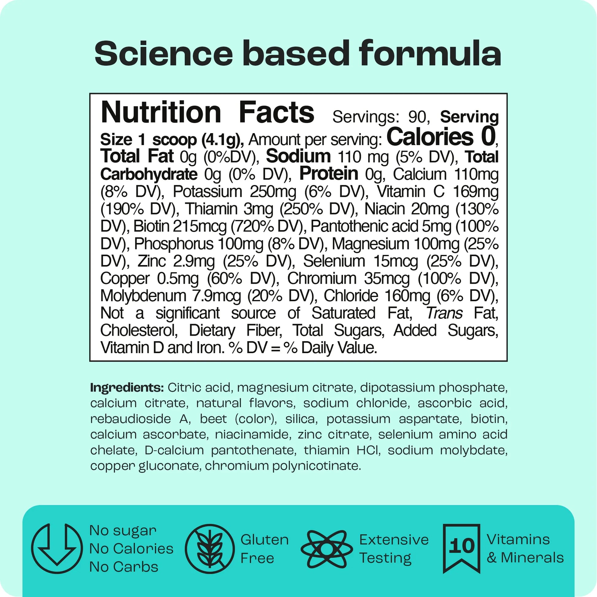 - Electrolytes You Can Trust - Hydrate your body, regulate nerve & muscle function and rebuild damaged muscle tissue with 6 key electrolytes: Magnesium, Potassium, Calcium & more. Enriched with 12 additional vitamins, this electrolyte mix drink is free from artificial colors and sweeteners.